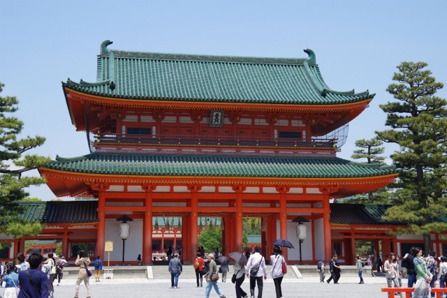 青空には朱色が映えますね~(´∀`)平安神宮は今回素通り予定でしたが、空との対比が綺麗だったので数枚だけ撮らせて頂きました♪