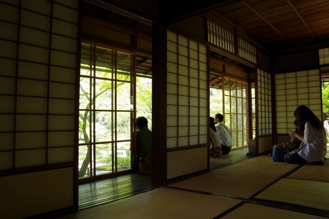 入場してすぐの所にある木造二階建ての母屋の1階部分では、写真のように縁側に腰かけてお庭をゆったりと眺めることが出来ます。