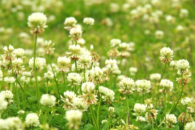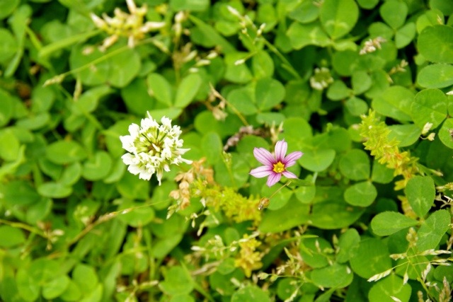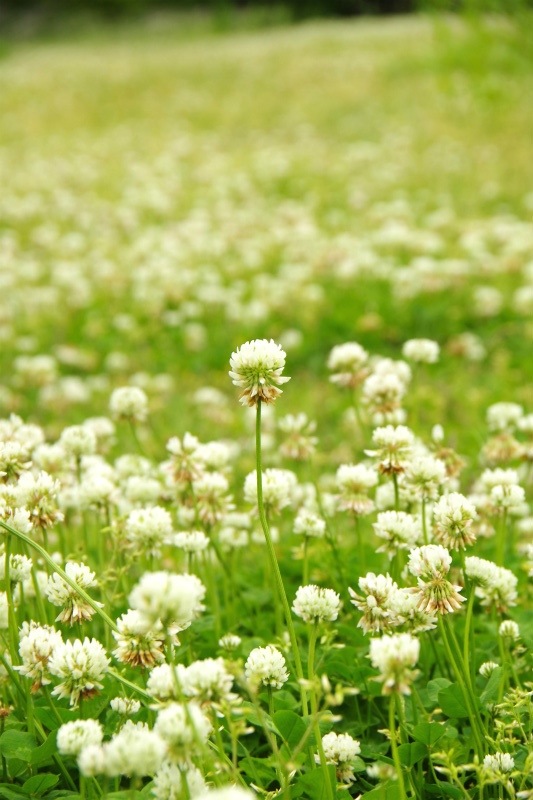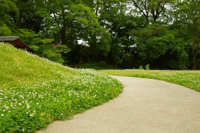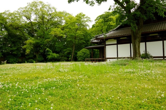 シロツメクサが一面に咲く閑院宮邸跡にて。