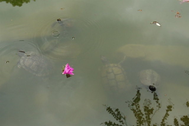 神社内の池には亀がたくさんいました。すごい寄ってきます(笑)