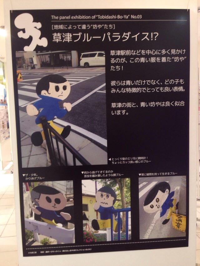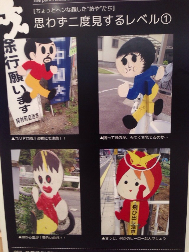 県内各地に点在する、様々な見た目の飛び出し坊やが大きなパネルで紹介されています。