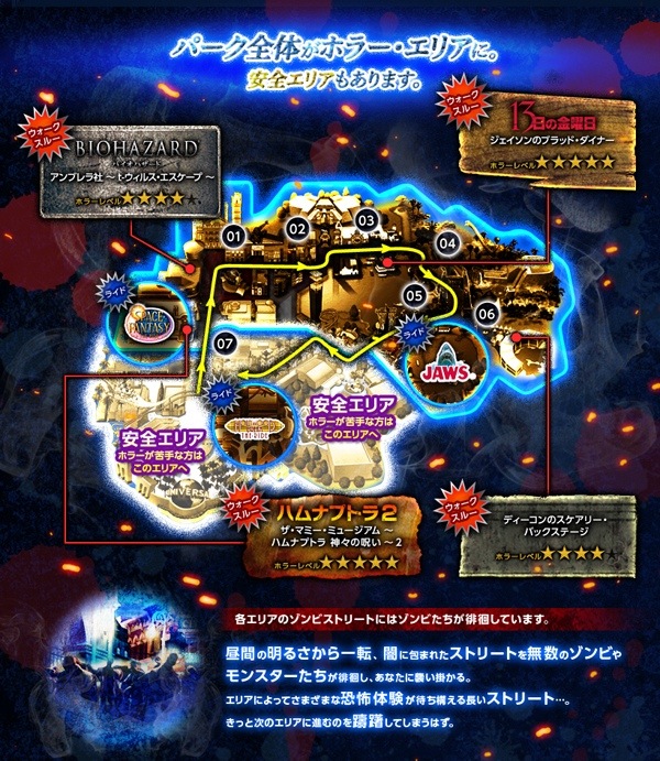ゾンビと兵士の戦闘が繰り広げられるエリアや、突然ゾンビに襲われてしまうエリアなど、パークの至る所で連続して巻き起こる様々な恐怖。