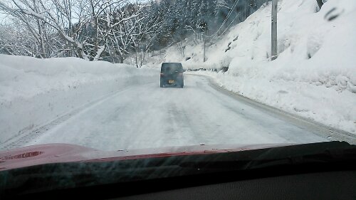 この日は前日までの雪と冷え込みで福井県にあるスキー場までの道中はこんな悪路でした(>_<) image