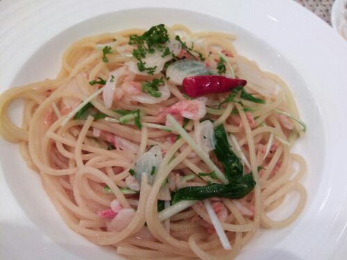 ランチセットにはオイルベースの桜えびと水菜のパスタに
