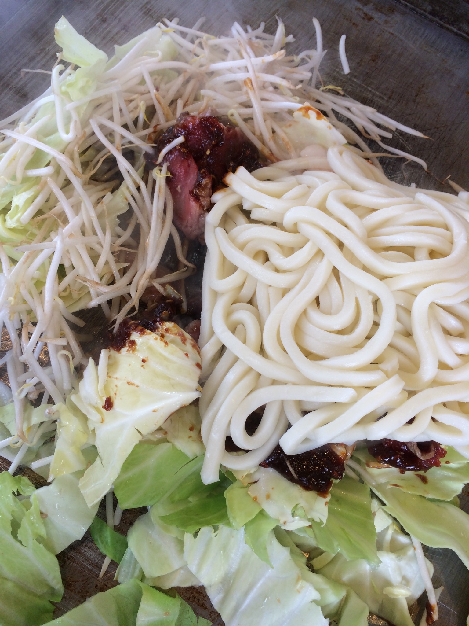 自分の好きなお肉と、うどん玉を頼むと野菜と味噌がお皿にのってやってくるスタイルで、それを鉄板で各自調理するという感じになっていました。