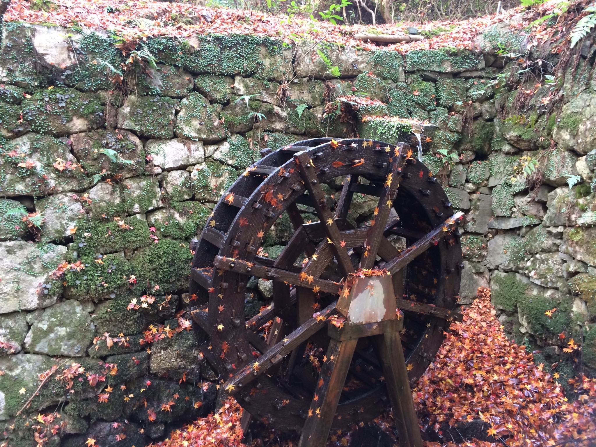 そして期待していた紅葉は、まず一つ目に見つけたものが水車に良い感じに張り付いたもみじでした!