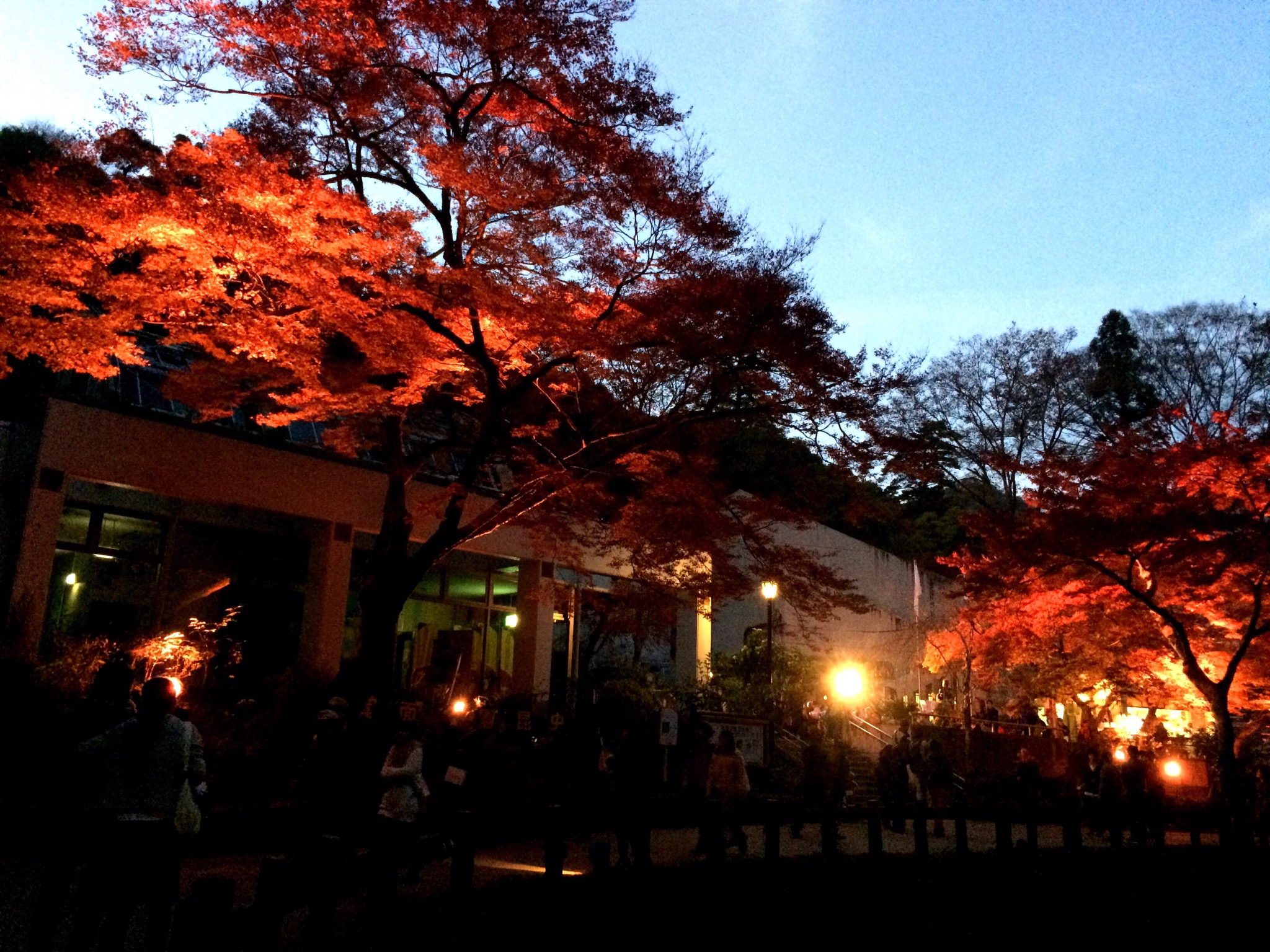 山道を抜けると行きと同じ元の道に戻ったのですが、ちょうど日が落ちてきてライトアップされた紅葉を見ることができました?