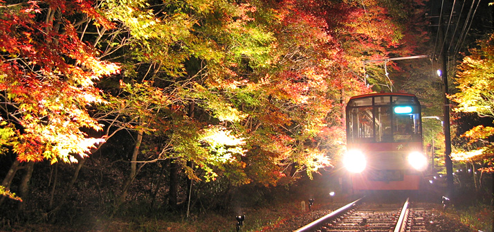 市原~ニノ瀬 間にある通称『もみじのトンネル』(約250m区間)をライトアップされており、この区間を通る電車は、車内の灯りを消し速度も落としながら進んでくれます。