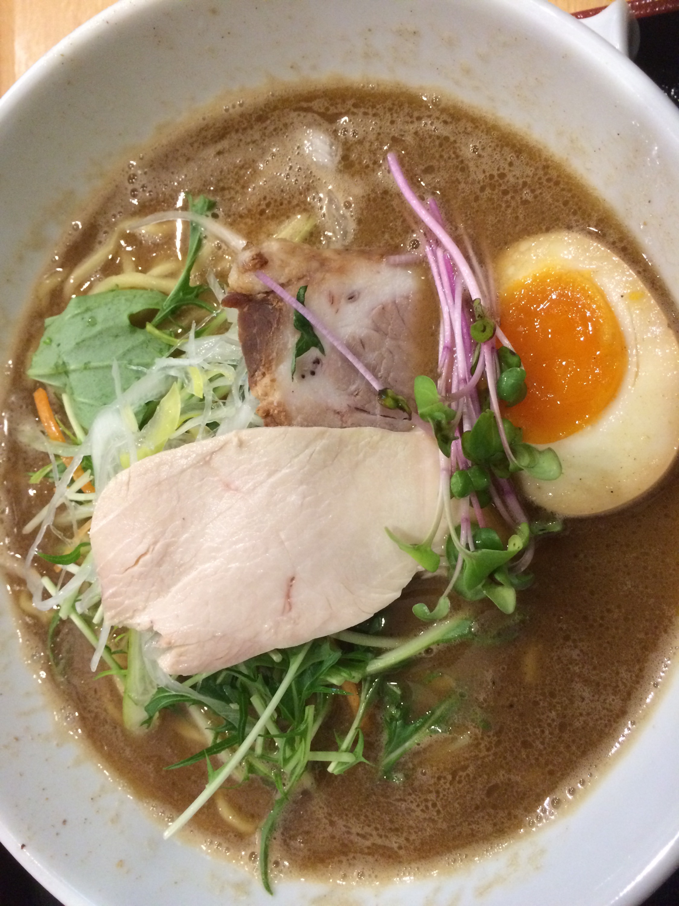 濃厚そうなスープの色で、トッピングはとってもお洒落なサラダっぽい雰囲気のラーメンでした!