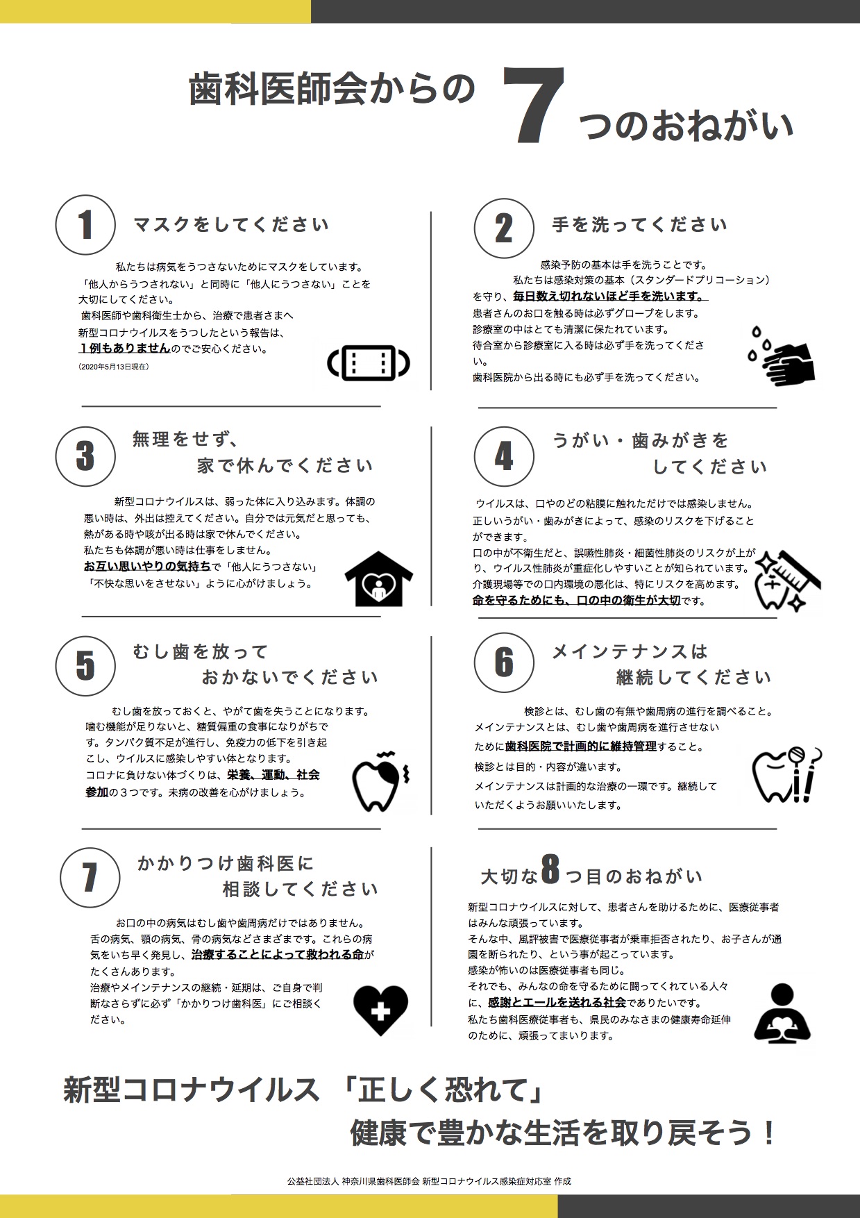 神奈川県歯科医師会が今月中旬39県の緊急事態宣言解除後に発表したものです。当院でもこの内容に準じて診療を行っております。