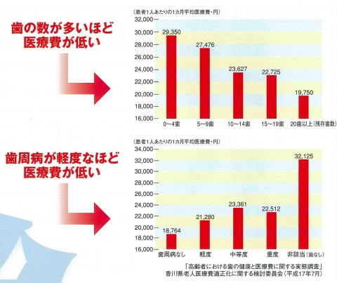 あと、香川県の調べでは歯の数が多いほど医療費が低いことや歯周病が軽度なほど医療費が低いという結果がでています。歯が一本もない人は20本以上ある人と比べて、月に医療費が1万円余計にかかっていることがわかります。歯と口の健康はそういう意味からすると全身にもお財布にも大きな影響を及ぼします。歯周病予防、歯を失うことを防ぐことは全身の健康を保つこと国民医療費の増加も抑えることにつながります。